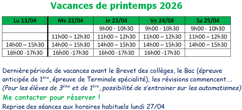 Mercredi : 14h00 – 15h30 ; 16h00 – 17h30 ; 18h00 -19h30.