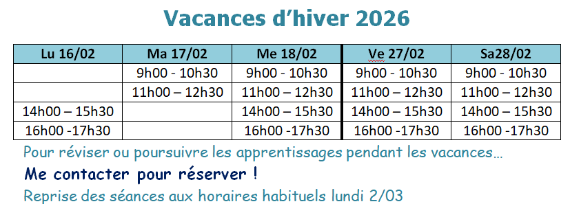 Mercredi : 14h00 – 15h30 ; 16h00 – 17h30 ; 18h00 -19h30.